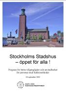 Åtgärdsprogram för bättre tillgänglighet och användbarhet för personer med funktions-nedsättning. Programmet grundar sig på en omfattande inventering av hinder och problem i Stadshuset år 2002. Programmet togs fram i samarbete med handikapporganisationerna. |