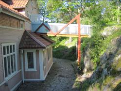 Nybyggnad för Skansens klädkammare nedanför hantverkskvarteren med ingång både från Hazeliusbacken (se bild) och uppifrån takterras-sen vid hantverkshusen. Byggnaden innehåller stora klädförråd under terrassbjälklaget och syateljéer mm med fönster mot gatan. |